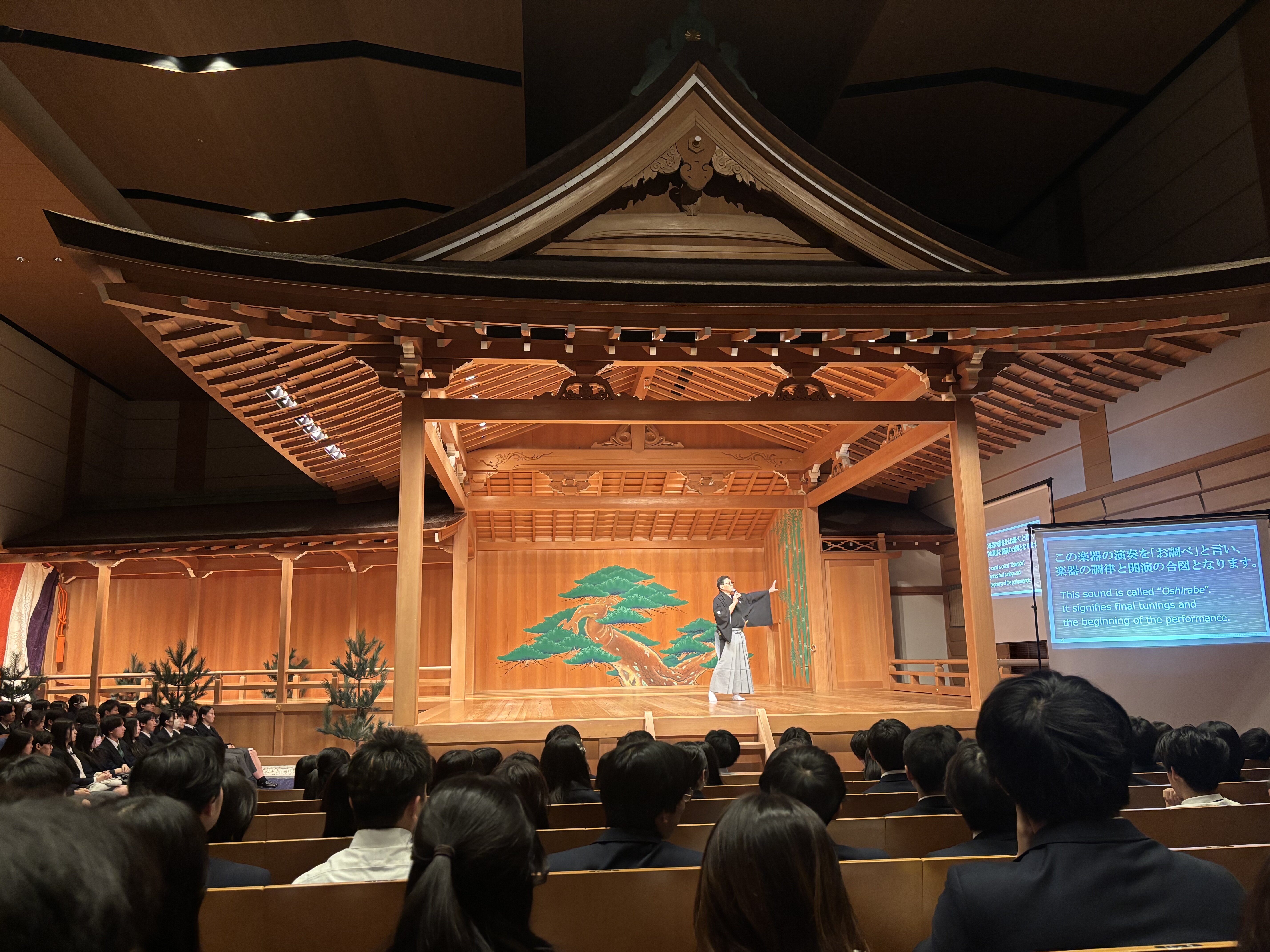 5年生の特別カリキュラムである「能狂言鑑賞会」が、3月12日に銀座の観世能楽堂で実施されました。こ の鑑賞会は本校において四半世紀以上続いている伝統行事です。鑑賞会に向け、観世流能楽師シテ方中森貫 太氏より能狂言の歴史、能面・楽器の基礎知識、能舞台の構造、当日の演目『船弁慶』に関する説明会も行なわれました。
